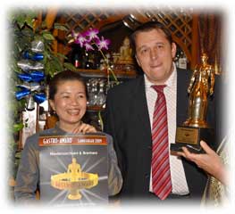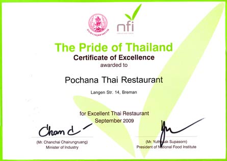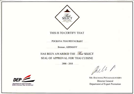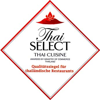 "Thai Select" ist eine Qualitätsauszeichnung, vergeben von der thailändischen Regierung an thailändische Restaurants im Ausland als Anerkennung für die Qualität, Authentizität und Sauberkeit der dort angebotenen Speisen und verwendeten Zutaten. Die Auszeichnung wurde uns am 30. Januar 2009 von Khun Chetanee Opaswatchai, Mitarbeiterin der thailändischen Botschaft in Berlin und des thailändischen Handelsministeriums in Bangkok, übergeben.