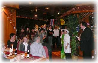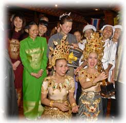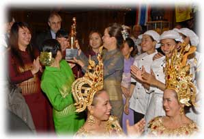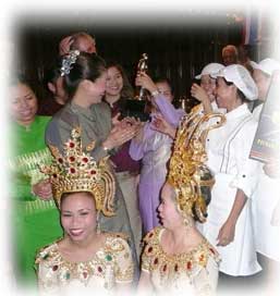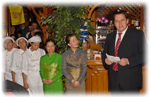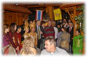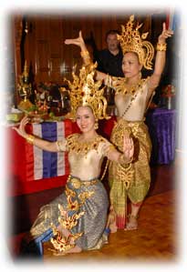 Khun Sinuan und Khun Pott, unsere beiden Thaitänzerinnen aus Hamburg, die wir auch eingeladen hatten, überraschten uns und die Anwesenden mit zwei traditionellen Thaitänzen, die sie sonst zweimal im Monat an Samstagabenden bei uns aufführen.