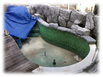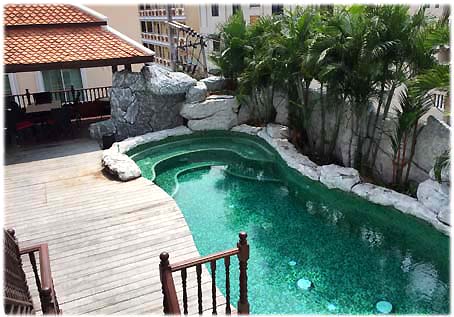 Weiter nach links durch einen Gang, mit angrenzenden Behandlungsräumen geht es weiter zum Spa. Dort ist der hier schon öfter beschriebene Spa- und Ruhebereich. Dieser wird gerne benutzt zwischen den Wartezeiten bei Behandlungsintervallen. Der Pool ist nun voll einsatzfähig und ein paar Sitzgelegenheiten sind auch da. Leider nichts Neues über die beabsichtigten typischen Thaimassagen für zwischendurch, aber wie das halt so ist mit Vorhaben und Ausführung
