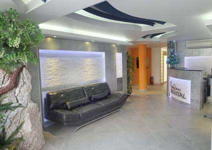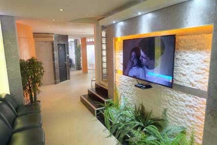 Patienten mit entsprechender Wartezeit vor dem Behan dlungstermin oder zwischen zwei oder drei Zeittherapien können einen Spa-Wellness-Bereich im Obergeschoss nutzen. In diesem ist ebenfalls ein Pool mit Wasserfall und eine Cafeteria angegliedert.