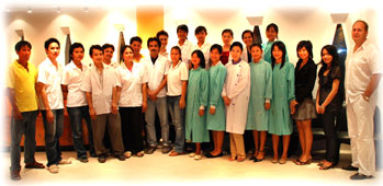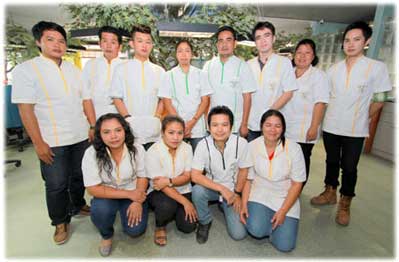 Das Team Schlatter besteht aus seiner Frau Srisutha, zuständig für das Personal und Patientenempfang, drei Zahnärztinnen, wovon zwei eine Implantatausbildung haben, vier ausgebildeten Zahnarzthelferinnen und zwei „Azubis“ als Zahnarzthelferinnen. Im zahntechnischen Labor arbeiten acht Zahntechniker, ein Zahntechnikmeister und vier weitere „Azubis“ Dass das thailändische Personal auf höchstem deutschen Niveau arbeitet, versteht sich von selbst.