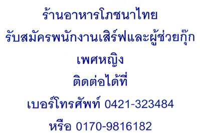 Arbeit haben wir genug… nur die schaffen wir nicht mehr alleine. Darum suchen wir von Zeit zu Zeit, thailändische Mitarbeiter, bzw. Mitarbeiterinnen, für den Service, aber auch für die Küche. Wenn Sie in einer typisch thailändischen Umgebung, nicht nur arbeiten, sondern mit anderen Thais auch dem entsprechenden thailändischen Sanuk nachgehen wollen,